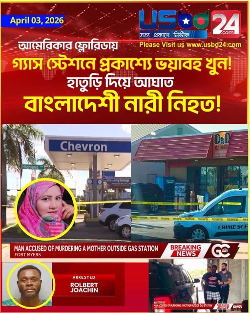 আমেরিকার ফ্লোরিডায় ফোর্ট মায়ার্সে Chevron গ্যাস স্টেশনে বাংলাদেশী নারীকে হাতুড়ি দিয়ে আঘাত করে হত্যা,সন্দেহভাজন গ্রেফতার।ফোর্ট মায়ার্স, ফ্লোরিডাঃ যুক্তরাষ্ট্রের ফ্লোরিডা অঙ্গরাজ্যের ফোর্ট মায়ার্স শহরে একটি গ্যাস স্টেশনে ভয়াবহ হামলায় এক বাংলাদেশী নারী নিহত হয়েছেন। ঘটনাটি স্থানীয় বাংলাদেশী কমিউনিটিতে গভীর শোকের সৃষ্টি করেছে।নিহত নারী নিলুফার ইয়াসমিন পারভীন ওই গ্যাস স্টেশনের একজন কর্মী বিস্তারিত..